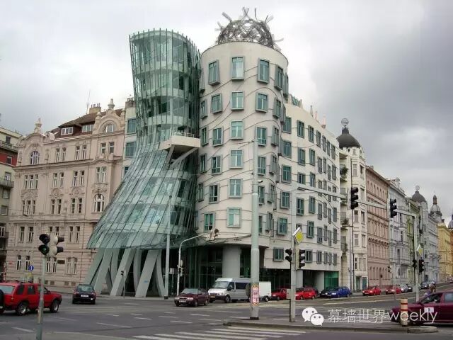 房子造型充滿曲線韻律,蜿延扭轉(zhuǎn)的雙塔就像是兩個(gè)人相擁而舞,因此被稱為“跳舞的房子”———左邊是玻璃帷幔外觀的“女舞者”,上窄下寬像舞裙的樣子,右邊圓柱狀的則是“男舞者”,所以又有人以著名的雙人舞者金姬·羅杰斯及弗雷德·阿斯泰爾將大樓命名為“金姬和弗雷德”,兩棟建筑物像極了他們舞影婆娑的樣子。這棟建筑從規(guī)劃到完成卻是貶多于褒,尤其是設(shè)計(jì)者法蘭克·格里曾被稱為“外星人美國(guó)建筑師”。捷克人就戲稱街角那個(gè)玻璃曲線塔為“被扭曲的可口可樂(lè)瓶”,大部分人甚至認(rèn)為這棟房子是美國(guó)繼二戰(zhàn)后在歐洲投下的第二顆炸彈,是一個(gè)破壞城市紋理的象征。