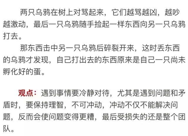 觀點:遇到事情要冷靜對待,尤其是遇到問題和矛盾時,要保持理智,不可沖動,沖動不僅不能解決問題,反而會使問題變得更糟,最后受損失的還是整個團隊。